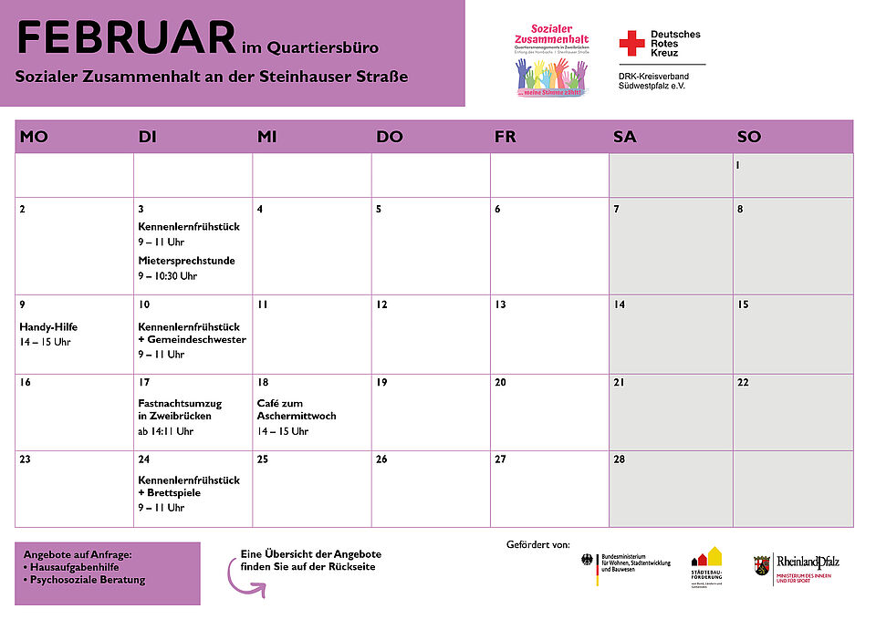 DRK-Quartiersmanagerin Kim Breisch ist seit 2018 im Quartier Sozialer Zusammenhalt an der Steinhauser Straße tätig und hat im Jahr 2022 auch das Quartier Sozialer Zusammenhalt entlang des Hornbachs übernommen. In letzterem ist seit 2013 bereits der DRK-Quartierstreff verortet, der den Mitarbeitern des Sozialen Zusammenhaltes seit Beginn der Quartiersarbeit in Zweibrücken im Jahr 2016 zum Einstieg in die Materie verhalf. Das Städtebauförderprogramm Sozialer Zusammenhalt unterstützt in Not geratene Quartiere finanziell - vor allem auf städtebaulicher Ebene. Aber auch der soziale Aspekt darf in den Quartieren nicht vergessen werden. So sorgen die Quartiersmanager*innen vor Ort für generationenübergreifende, interkulturelle und abwechslungsreiche Angebotsstrukturen innerhalb der Quartiere, vernetzen und vereinen Menschen und Gemeinschaften.