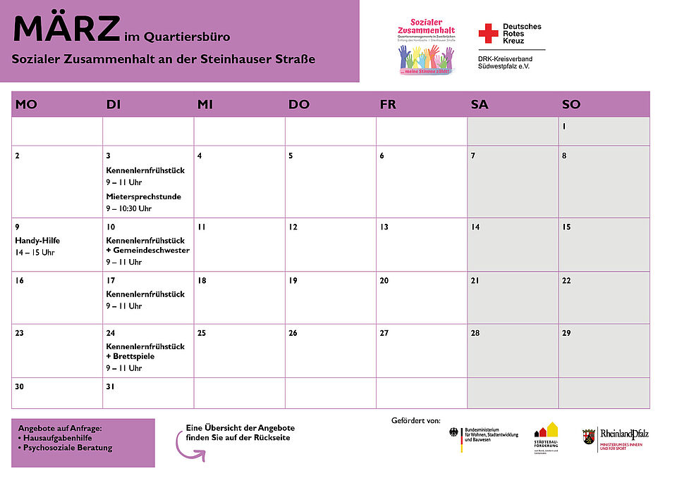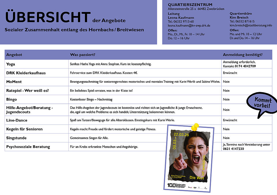 DRK-Quartiersmanagerin Kim Breisch ist seit 2018 im Quartier Sozialer Zusammenhalt an der Steinhauser Straße tätig und hat im Jahr 2022 auch das Quartier Sozialer Zusammenhalt entlang des Hornbachs übernommen. In letzterem ist seit 2013 bereits der DRK-Quartierstreff verortet, der den Mitarbeitern des Sozialen Zusammenhaltes seit Beginn der Quartiersarbeit in Zweibrücken im Jahr 2016 zum Einstieg in die Materie verhalf. Das Städtebauförderprogramm Sozialer Zusammenhalt unterstützt in Not geratene Quartiere finanziell - vor allem auf städtebaulicher Ebene. Aber auch der soziale Aspekt darf in den Quartieren nicht vergessen werden. So sorgen die Quartiersmanager*innen vor Ort für generationenübergreifende, interkulturelle und abwechslungsreiche Angebotsstrukturen innerhalb der Quartiere, vernetzen und vereinen Menschen und Gemeinschaften.